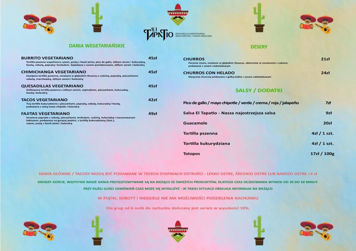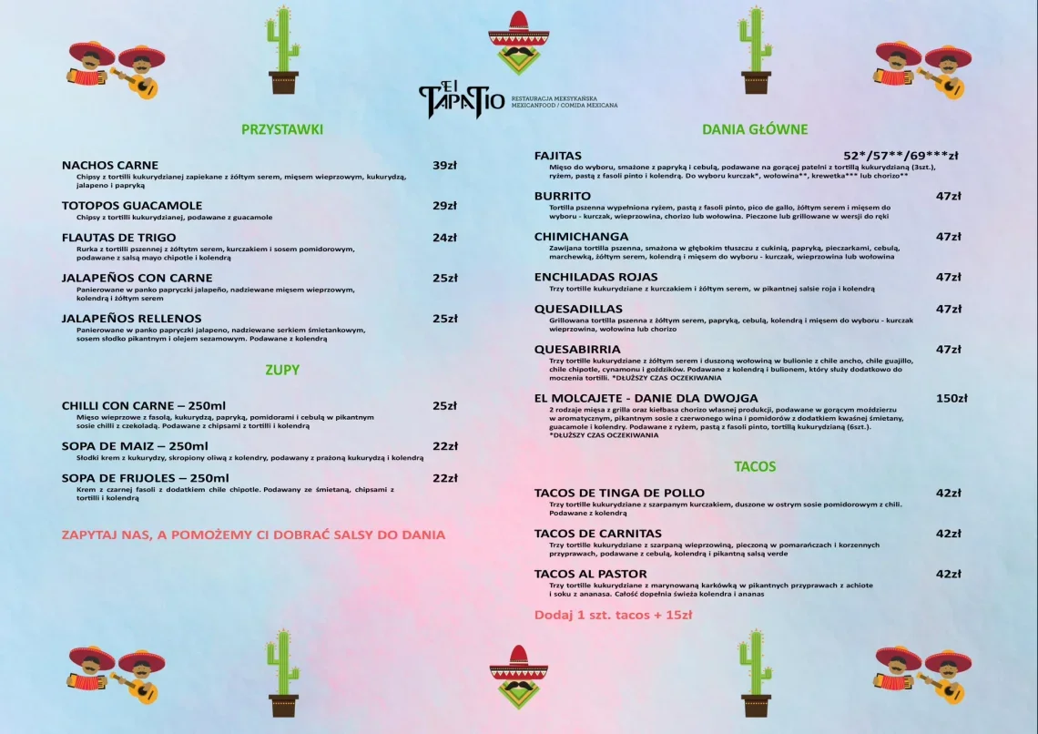 Obsługa restauracji zrobi wszystko co w jej mocy by każda szczególna chwila, którą zechcą Goście uczcić w naszym lokalu pozostała niezapomniana na długi czas. Zaproś swoich przyjaciół, rodzinę i zarezerwuj stolik, aby spędzić niezapomniany wieczór w rytm meksykańskich dźwięków delektując się wyśmienitą kuchnią ?